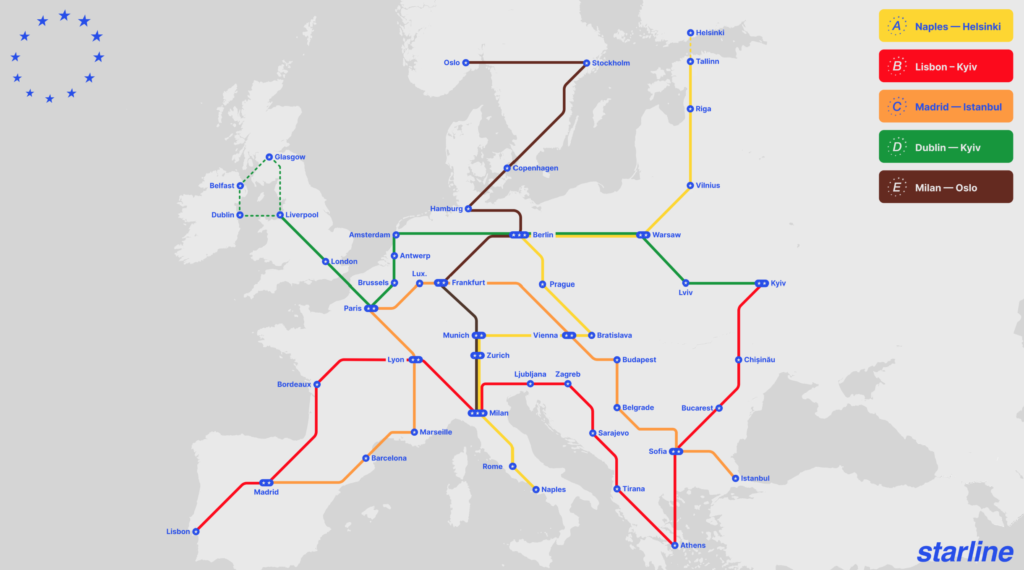 ‘Starline’ er et blueprint fra 21st Europe på et samlet toghøjhastighedsnet, der i modsætning til Europas eksisterende jernbanenet hurtigt og nemt forbinder kontinentet på tværs af grænser. På netværksmødet arbejder vi med blueprints for hele Helsingør.